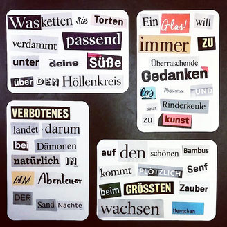 Zuletzt erprobt wurden außerdem "OVILLEJOS" - ein Mikro-Poem aus drei Fragen mit kurzer Antwort und einem anschließenden Vierzeiler, der alle drei vorausgegangenen Reimwörter nochmal integriert.